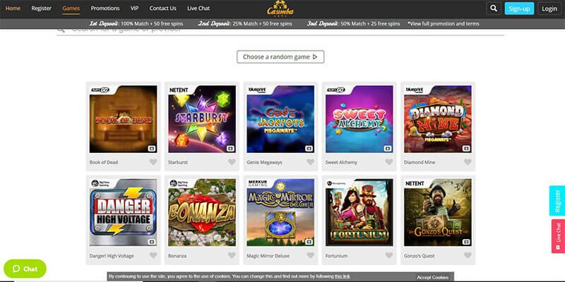 Pokies run the show at Casimba Casino, but there is a decent selection of live and virtual table games on offer as well. RNG games number around 40, and include blackjack, poker and roulette. Blackjack in particular has a good range of table limits, depending on which of the variants you choose. Baccarat fans have a choice of one virtual and one live version. As well as the regular table games, Casimba Casino also provides a range of scratchcards and some fun games like Virtual Champs League.Live Casino